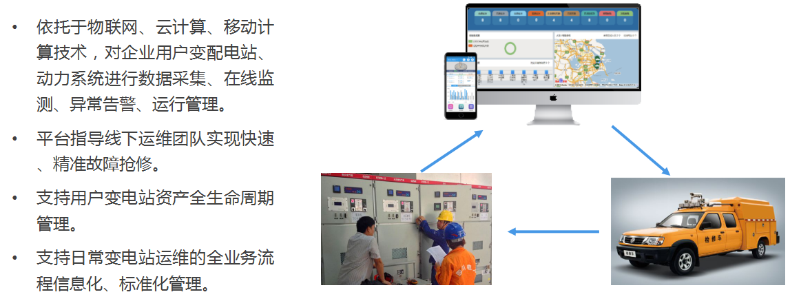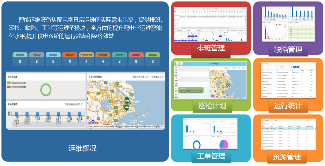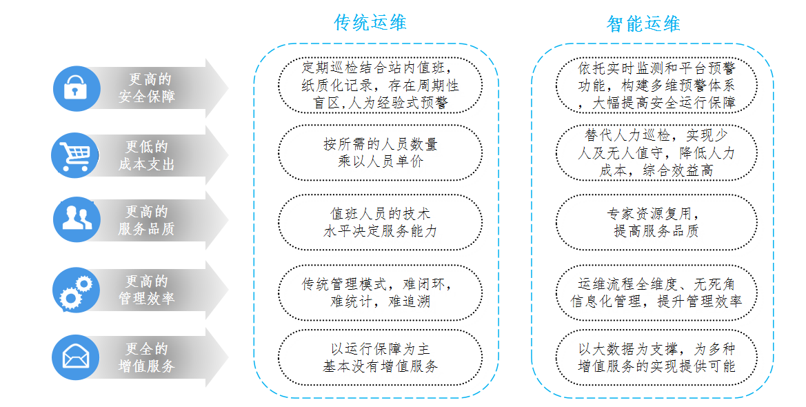 “智能運維”也叫“智能電力運維服務”,是傳統(tǒng)電力運維結合“互聯(lián)網(wǎng)+”技術以及共享思維而產生的新型電力管理模式,通過線上平臺+線下運維團隊+APP,構建新的運維服務支撐體系,有效提升變電站運行的安全、效率和經濟性。